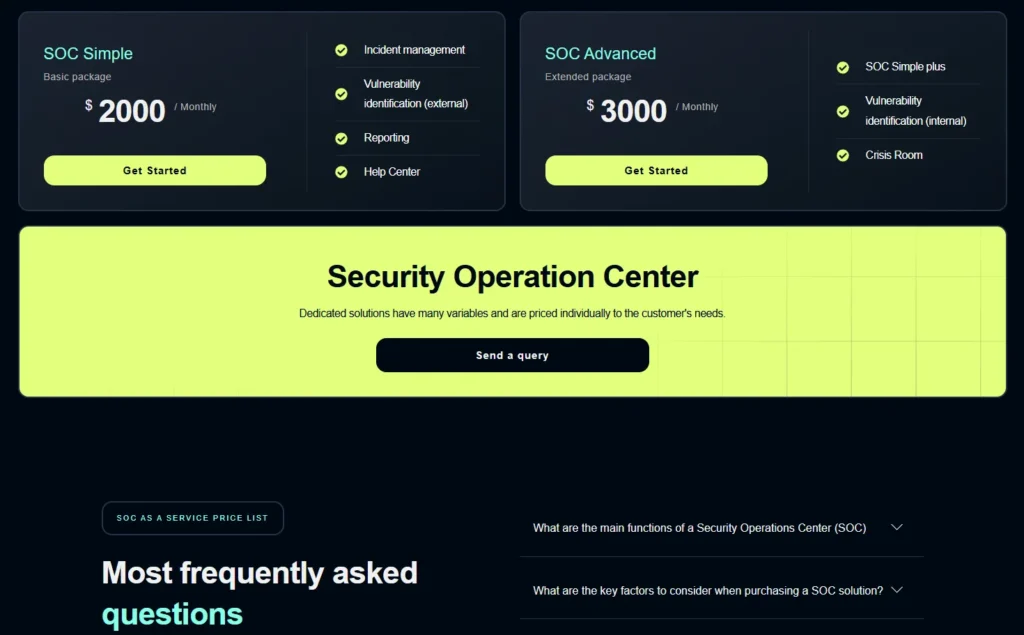 - O usłudze (Service): podstrona opisująca szczegółowo, na czym polega usługa SOC oferowana przez baseSOC. Ta sekcja wyjaśnia kluczowe funkcje Security Operations Center, takie jak monitoring systemów, analiza zagrożeń, reakcja na incydenty i zapobieganie atakom. Treści są zaprojektowane z myślą o osobach nietechnicznych – język pozostaje zrozumiały, skupiając się na korzyściach biznesowych (np. ochrona danych klientów, ciągłość działania, zgodność z przepisami). Znajdziemy tu również informacje o tym, dlaczego outsourcing SOC się opłaca – np. porównanie z budową własnego SOC, wskazanie oszczędności i dostępu do ekspertów. Podstrona „O usłudze” przygotowuje grunt pod zainteresowanie ofertą, które finalnie ma skierować użytkownika do zapoznania się z cennikiem lub kontaktu.