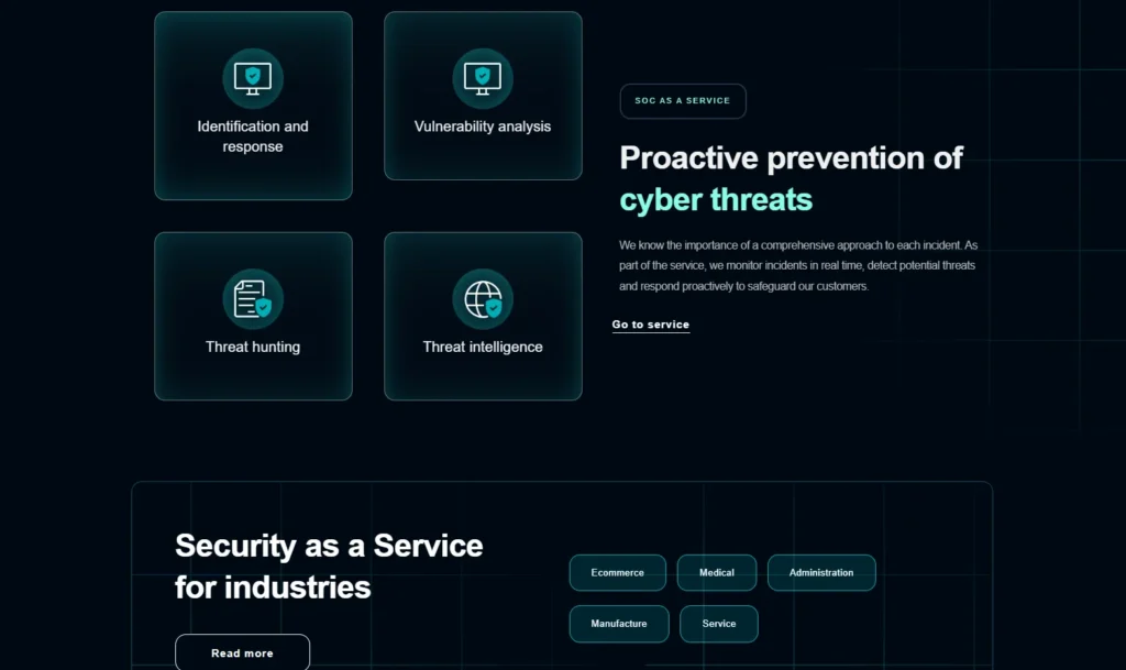- Strona główna (Home): punkt wyjścia z głównym przekazem marketingowym. Zawiera hasło przewodnie o SOC jako usłudze, kluczowe liczby (lata doświadczenia, liczba incydentów, eksperci itp.), skrócony przegląd oferty oraz wybrane referencje klientów i najnowsze wpisy z bloga. Na samej górze strony głównej umieszczono call to action kierujące do sekcji „O usłudze” bądź cennika (np. przycisk „Dowiedz się więcej”), tak aby od razu zaangażować odwiedzającego.