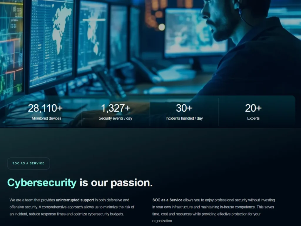 Dla kogo i z jaką intencją? Celem projektu było stworzenie strony internetowej baseSOC z myślą o firmach i instytucjach szukających kompleksowej ochrony przed cyberzagrożeniami w Polsce i za granicą. Blue Energy chciała skierować ofertę do osób decyzyjnych w IT i biznesie, które potrzebują profesjonalnego monitoringu bezpieczeństwa 24/7 bez konieczności budowania własnego zespołu SOC. Intencją było zaprezentowanie usługi SOC jako usługi (SOCaaS) – czyli zewnętrznego Security Operations Center, które działa non-stop i proaktywnie chroni infrastrukturę klienta. Strona miała przekonać odbiorców, że dzięki baseSOC ich dane i systemy będą monitorowane całą dobę z natychmiastową reakcją na incydenty, co zwiększy bezpieczeństwo przy optymalnych stałych abonamentowych kosztach.