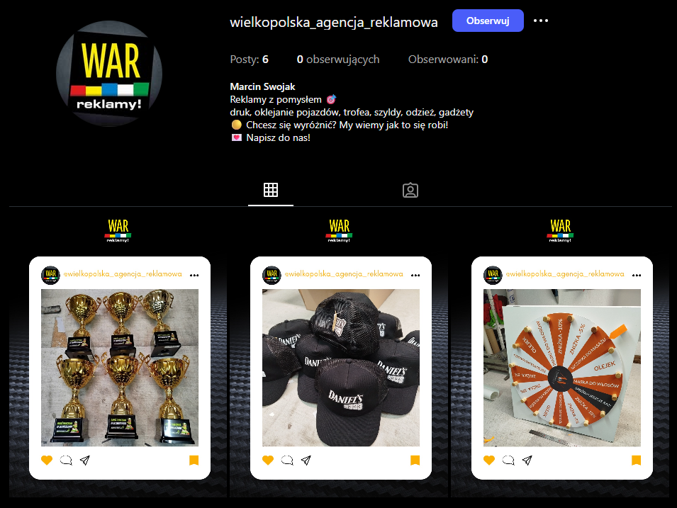 WAR Leszno to agencja reklamowa z 30 letnim doświadczeniem na rynku lokalnym. Zajmują się drukiem, gadżetami reklamowymi, oklejaniem pojazdów, produkcją medali i trofeów sportowych. Ich styl to charakterystyczna mieszanka graffiti, industrialu i odważnych kolorów. Klient przyszedł z potrzebą odświeżenia strony internetowej, wdrożenia dropshippingu oraz stworzenia profilu instagrama z myślą o przyszłych działaniach reklamowych.