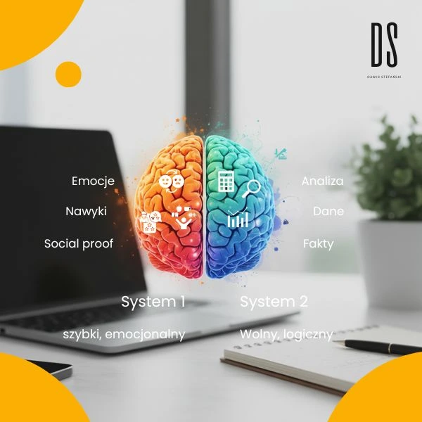 Dobry copywriting nie celuje w logikę. Dobry copywriting celuje w emocjonalny „System 1” (szybkie, intuicyjne myślenie), dostarczając jednocześnie „Systemowi 2” (wolne, analityczne myślenie) paliwa do uzasadnienia zakupu. Te „triki” to po prostu sposoby na skuteczną komunikację z obiema częściami mózgu Twojego klienta.